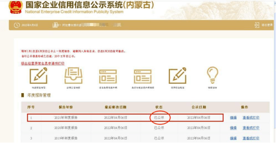 ●报送成功后页面自动显示记录,注意检查并核对公示状况为“已公示”。